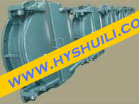節(jié)能型側(cè)翻式拍門(mén)運(yùn)行中的兩大關(guān)鍵點(diǎn)是:止水密封功能和啟閉靈活度。拍門(mén)的止水裝置為結(jié)構(gòu)型門(mén)葉,密封裝置為橡膠;門(mén)葉必須具有均勻的受力設(shè)計(jì)(如:弧度、扇形加強(qiáng)筋),而密封橡膠中以丁晴橡膠最為理想,具有耐沖擊、抗老化和耐腐蝕的功能。